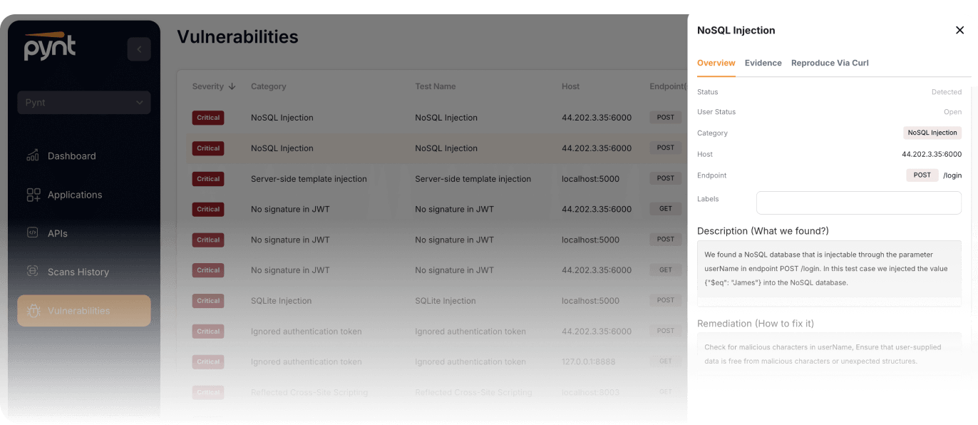 Pynt is designed to identify any vulnerability that can be found through API security testing - from OWASP API Security Top 10, OWASP Web Top 10, OWASP LLM Security Top 10, as well as our security tests, catering to complex applications and complex business logic scenarios.